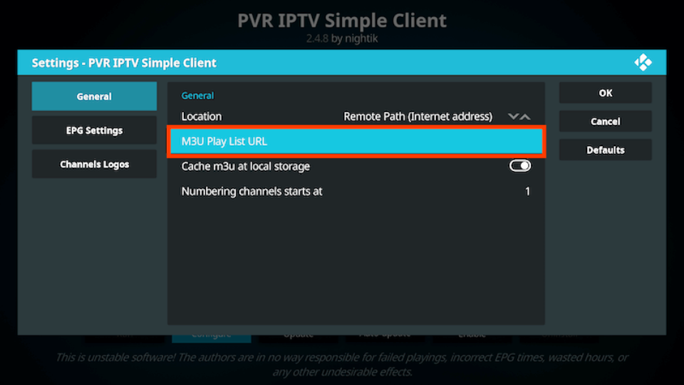 - In General select M3U Play List URL