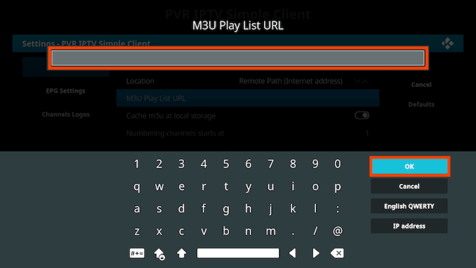 - Enter the URL of your M3U Play List (you will get this from your IPTV supplier) and select OK