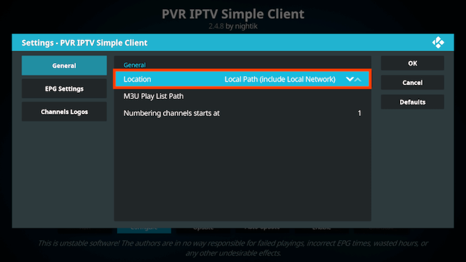 - If you have an M3U text file stored locally on your network/computer/box then set the Location to Local Path (include Local Network)